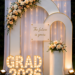 This is where your moment takes center stage. Designed with layered elements, soft lighting, and elevated styling, this setup creates a polished, photo-ready experience that feels both modern and unforgettable. Includes: *Layered arch backdrop (gold + white panels) *Full chiffon draping backdrop *Enhanced floral styling (garlands + clustered accents) *2 pedestals with covers *Custom square acrylic sign (personalized text) *Coordinated floral arrangements *Uplighting + fairy light accents *Full styled installation Perfect for: *Graduation photos *Birthday celebrations *Social media–ready setups Enhance your setup with custom signage, additional florals, color customization, and more.